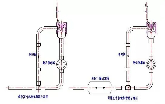 圖示翅片盤管作冷凝器使用時(shí),冷凝液體直接通過(guò)單向閥,不通過(guò)圖中毛細(xì)管;作蒸發(fā)器用時(shí),制冷劑經(jīng)過(guò)主毛細(xì)管一次節(jié)流后,再由分流毛細(xì)管分流。