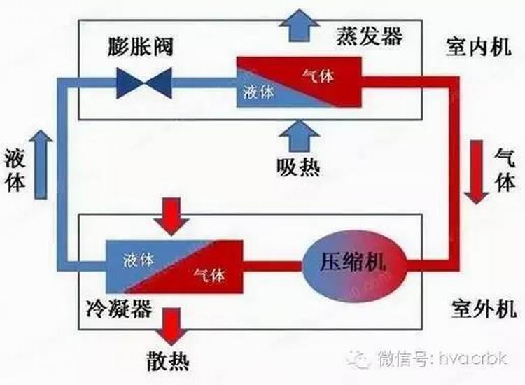 制熱的時候有一個叫四通閥的部件,使冷媒在冷凝器與蒸發(fā)器的流動方向與制冷時相反,所以制熱的時候室外吹的是冷風(fēng),室內(nèi)機吹的是熱風(fēng)。其實就是用的初中物理里學(xué)到的液化(由氣體變?yōu)橐簯B(tài))時要排出熱量和汽化(由液體變?yōu)闅怏w)時要吸收熱量的原理。
